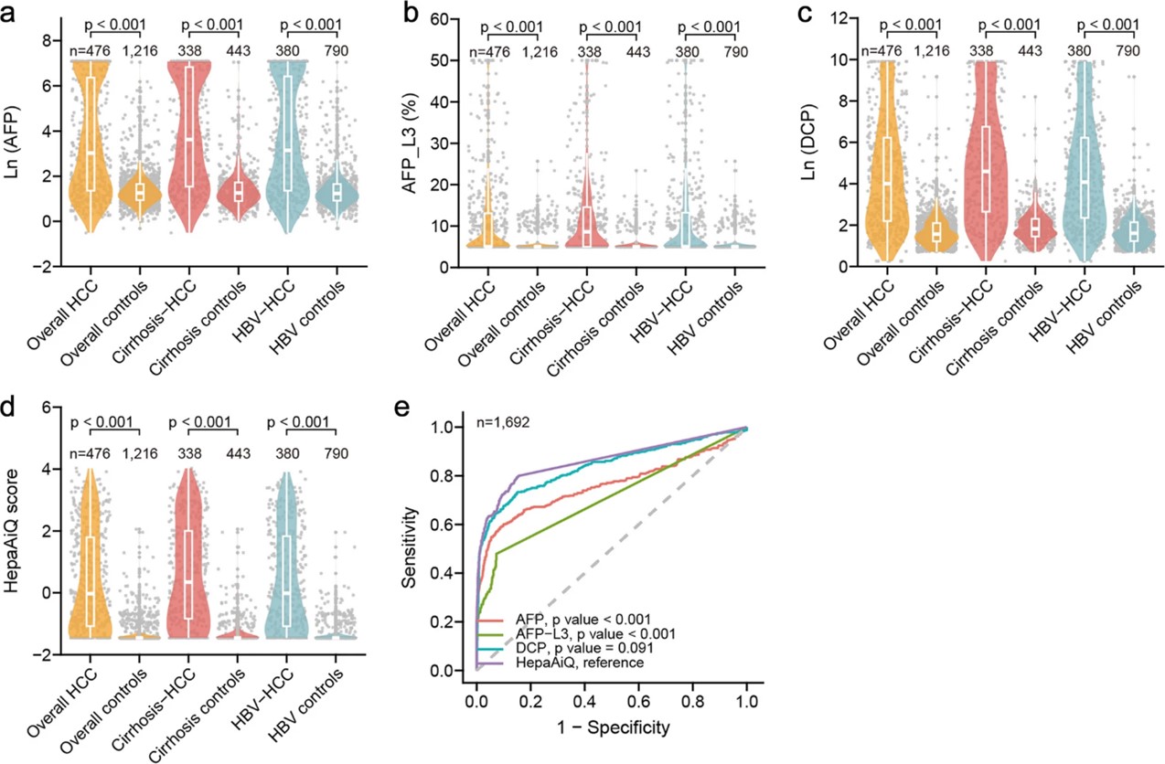 第一阶段:单标志物性能评估。研究团队在1,692例受试者(包括476例HCC患者和1,216例对照)中,系统比较了HepaAiQ® ctDNA甲基化检测与传统血清标志物AFP、AFP-L3、DCP的诊断性能。