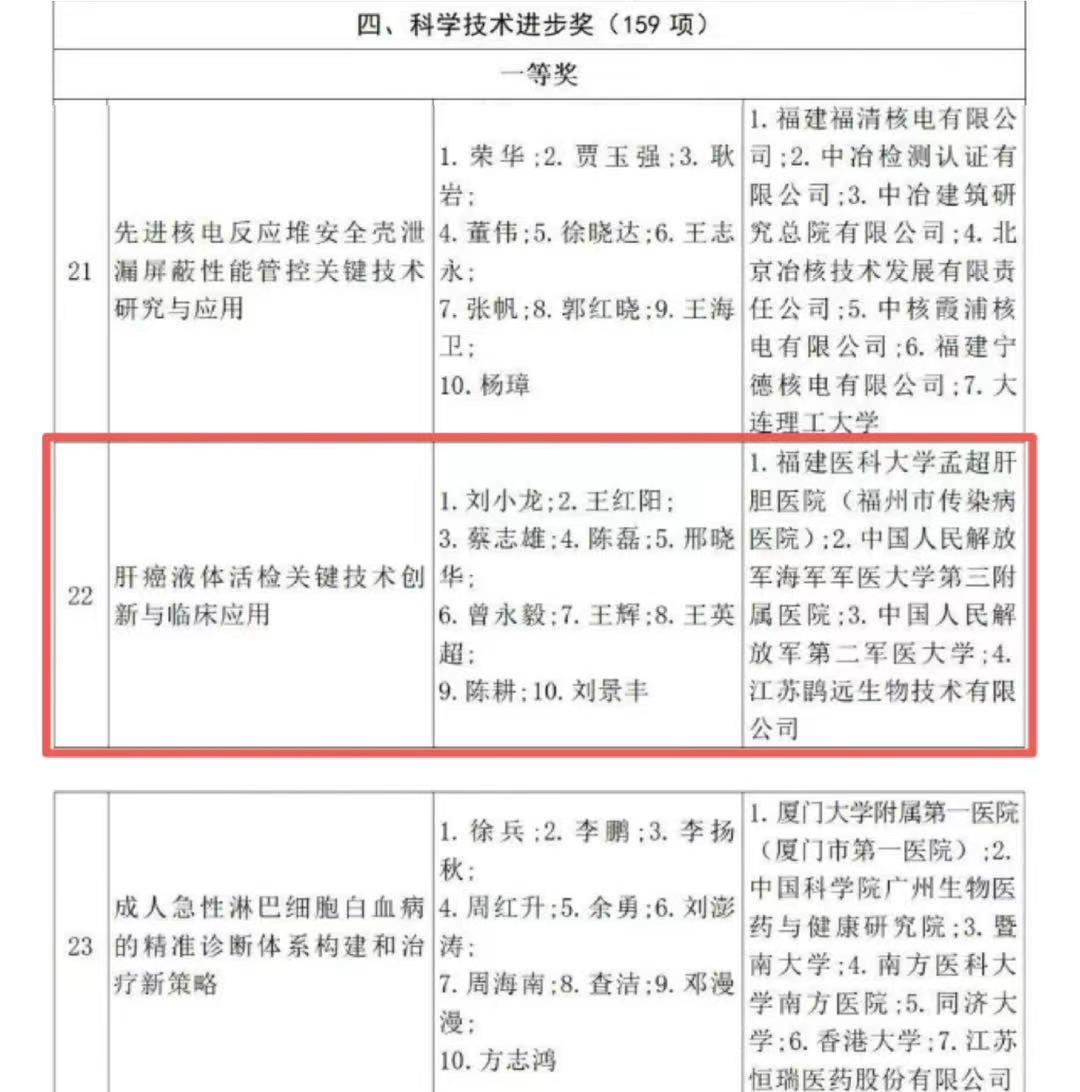近日,福建省人民政府发布2024年度福建省科学技术奖获奖名单。由福建医科大学孟超肝胆医院刘小龙教授牵头,联合中国人民解放军海军军医大学第三附属医院、中国人民解放军第二军医大学与鹍远生物等单位科研团队共同完成的科技成果——《肝癌液体活检关键技术创新与临床应用》荣获福建省科技进步奖一等奖。该奖项标志着鹍远生物在肝癌早期检测领域的科研实力与技术转化能力获得高度认可。