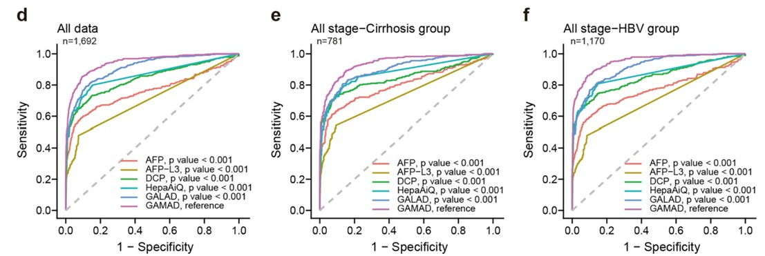 第三阶段:独立测试验证。在独立的测试集(含158例HCC患者和407例对照)中,对GAMAD模型的诊断效能进行最终验证,并与国际主流GALAD模型进行“头对头”比较。