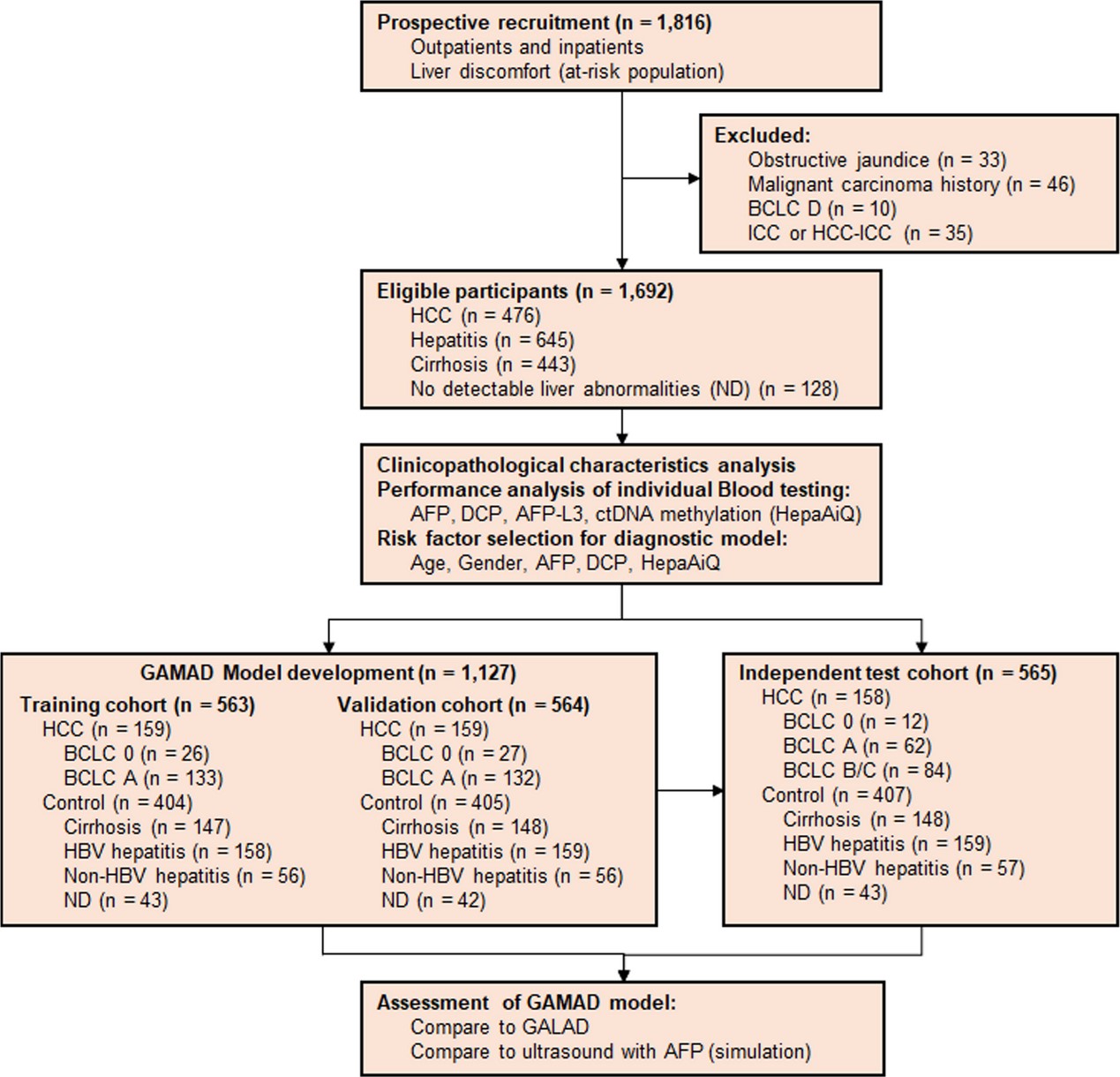 本研究共纳入1,692例受试者,包括476例肝细胞癌(HCC)患者和1,216例对照(645例肝炎、443例肝硬化、128例无肝异常者)。HCC患者中BCLC 0/A期占82.4%(392/476),BCLC B/C期占17.6%(84/476)。研究将66.6%(1,127例)患者用于模型开发(分为训练集和验证集),剩余33.4%(565例)作为独立测试集。